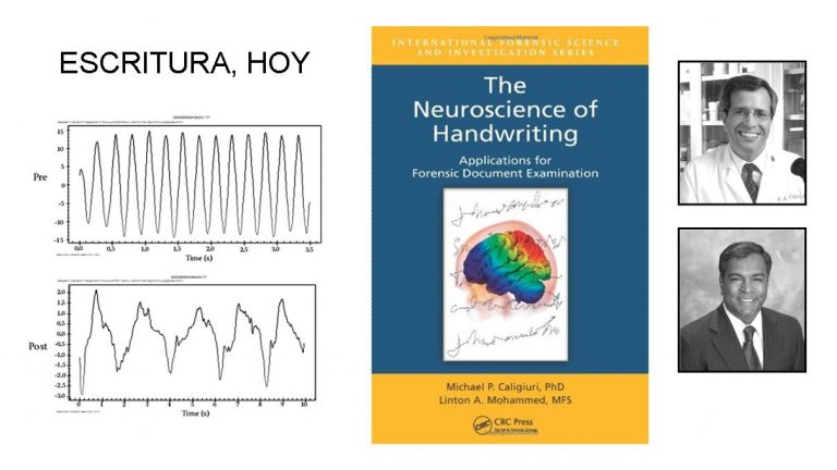 “La neurociencia de la escritura a mano: aplicaciones para el examen de documentos forenses” (1) de Michael P. Caligiuri (2) y Linton A. Mohammed surgió de las discusiones planteadas en la “Academia Estadounidense de Ciencias Forenses» y la «Sociedad Estadounidense de Examinadores de Documentos Cuestionados” (ASQDE). Los autores, expertos de esas entidades, se plantearon la necesidad de difundir las alteraciones relevantes del control motor manual normal y patológico en la escritura «con ejemplos de estudios de laboratorio recientes y en curso” para achicar “la brecha entre la teoría y la práctica” de los peritos en escritura, ya que los cuadros gráficos alterados, al estar científicamente objetivados, permiten un mayor grado de certeza  a