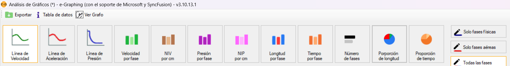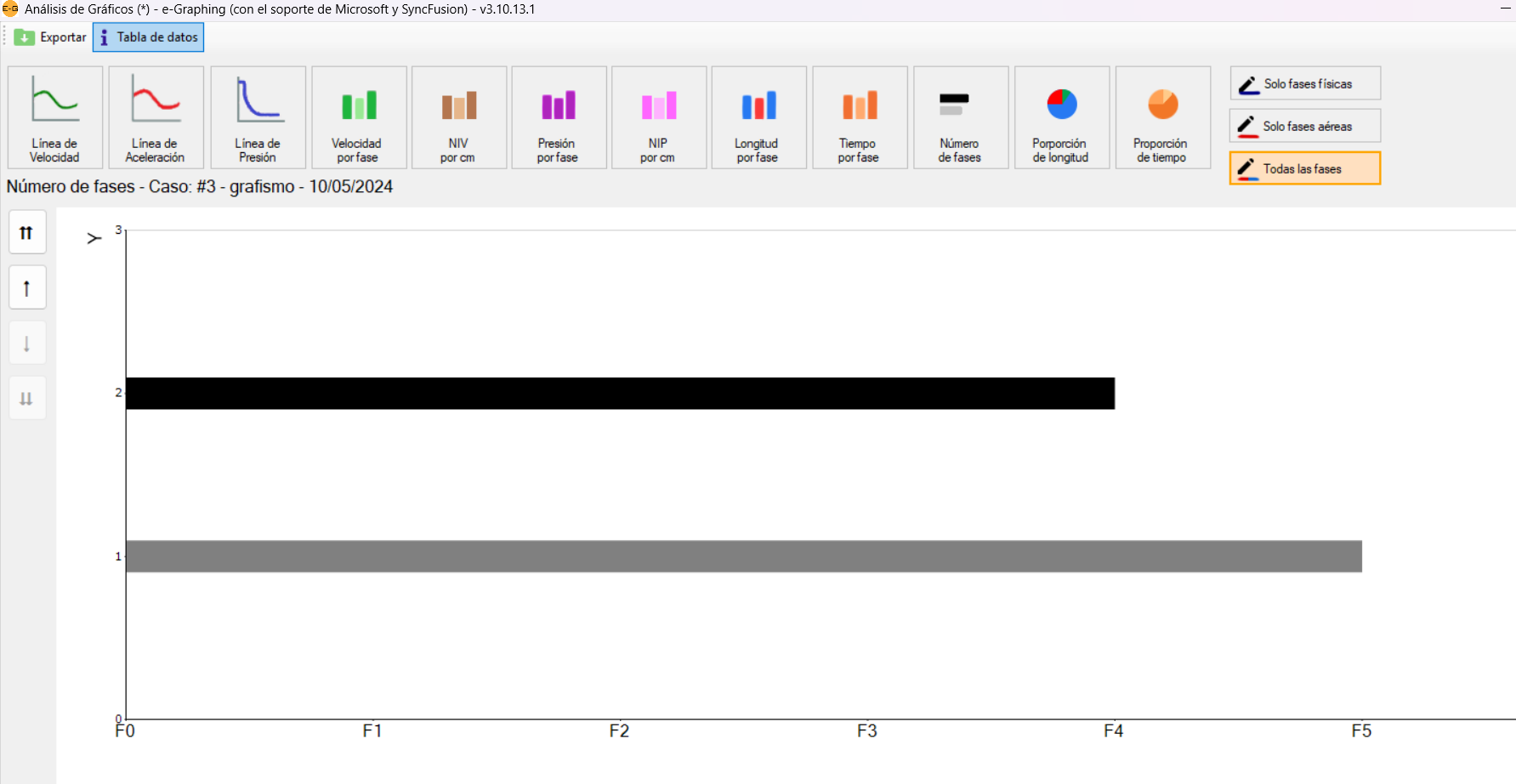 Muestra el gráfico de barras del índice de Velocidad fase por fase, en gráfico de baras. Aparecen los recursos propios de la pantalla emergente y se agregan opciones para seleccionar el tipo de fases a visualizar: