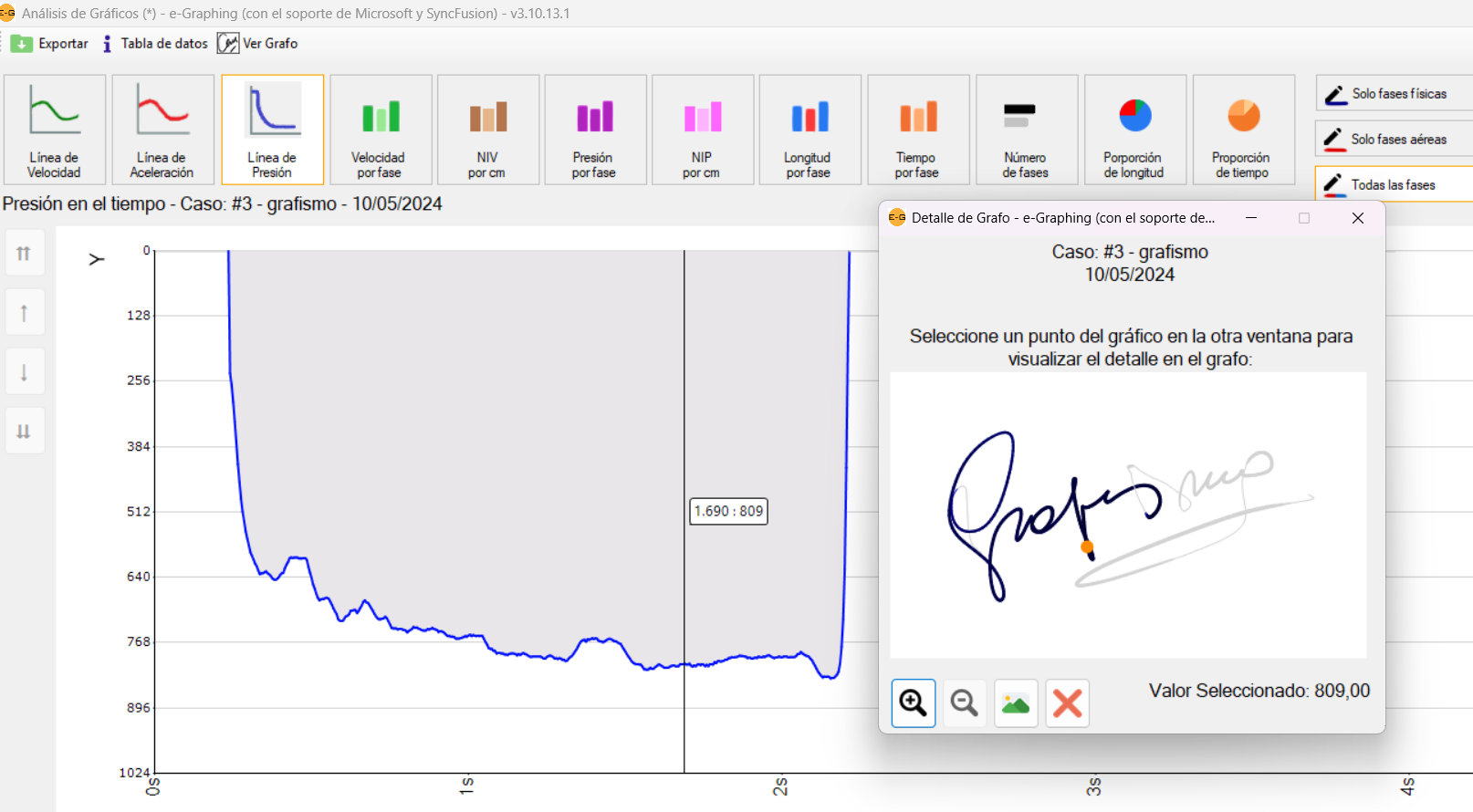 La curva de presión se muestra con una curva roja invertida para simular el relevamiento topográfico de la superficie del soporte (un papel, por ej.), hendido por la fuerza de inscripción. Al clickear en un punto sobre la curva roja, aparece el nivel de presión ejercido en esa posición específica. El soft mide hasta 1024 niveles de presión.